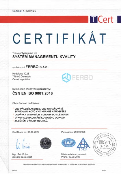 Certifikát procesu svařování ocelových konstrukcí a kovodělných výrobků
